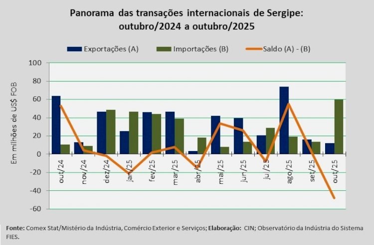 A balança comercial fechou o mês de outubro com saldo negativo de aproximadamente US$ 47,9 milhões. Esse saldo resulta da diferença entre o valor de exportações e importações no período.